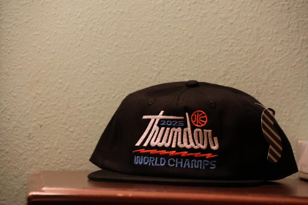 One of Bryan’s recent projects is a championship cap celebrating the Oklahoma City Thunder’s 2025 NBA title. It’s not official league merchandise, but rather a locally interpreted “World Champs” cap. Finished by Ment Apparel in Oklahoma City, it features a classic green underbrim and a cotton construction. Produced in small quantities through a short pre-order window, it’s less about mass production and more about capturing the heat of the moment as a keepsake.
