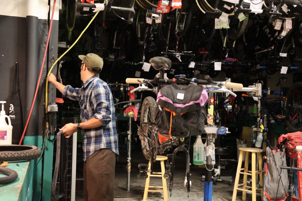 We had another ride planned for the next morning, so after closing the shop Nathan helped me fix it. He replaced the tube and showed me a method people here often use — adding sealant inside a regular tube.