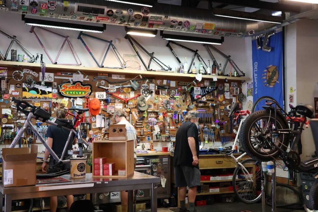 Today I visited my second bike shop in Oklahoma. DISTRICT BICYCLES opens at 10 a.m., so I took a slow ride through downtown to get there. This shop came up repeatedly when I asked on Instagram for local recommendations, so I’d already exchanged a few DMs just to confirm timing.