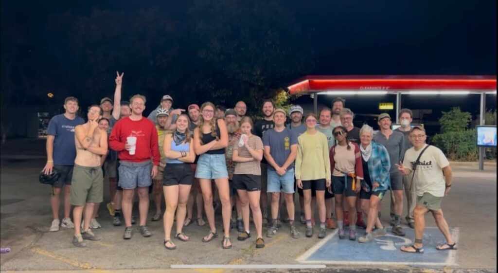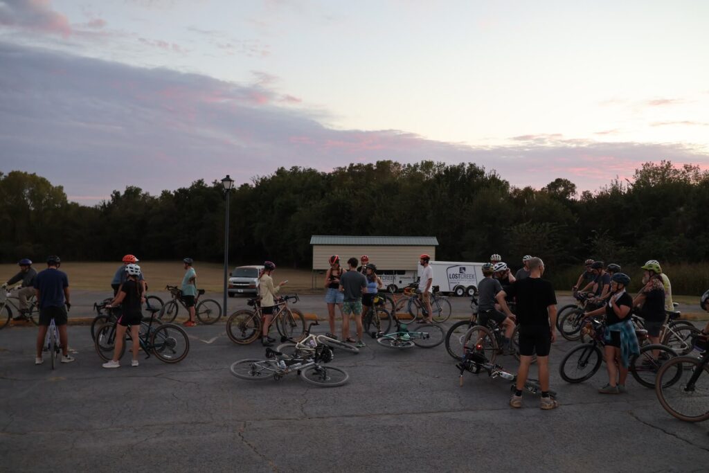 When I arrived at District Bicycles in the evening, more than twenty riders had already gathered. It turned out to be a fairly large group ride. Before we rolled out, Bobby introduced me as “Burrito House, visiting from Japan,” which genuinely meant a lot. It was also Evan’s birthday—one of the shop staff—and the ride doubled as a casual celebration. Moments like this capture something I really like about American riding culture.