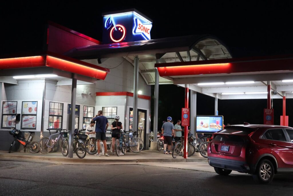 The ride was about about 25 miles round trip, with our turnaround point being SONIC, a hamburger chain that originated in Oklahoma. SONIC is traditionally a drive-in rather than a drive-through—you park, order through a speaker, and staff bring your food out to the car. It’s a very American, car-centric setup. The location we visited used a drive-through format, but as a cyclist, I could order at the speaker out front and they brought the food over. I ordered the recommended double cheeseburger. I don’t remember the price, but it was genuinely good.